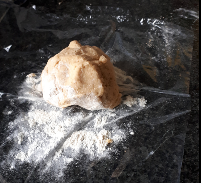 Koekjes: 60 g boter, 60 g licht bruine suiker, sap en rasp van ¼ citroen, ½ eigeel, 90 g zelfrijzende bloem, snuif zout