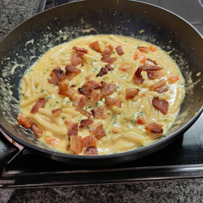 De macaroni gaarkoken volgens aanwijzingen op de verpakking, afgieten maar een deel kookvocht bewaren.