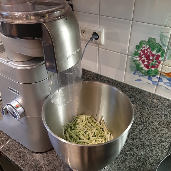 De ongeschilde courgette in slierten draaien of in de keukenrobot in kleinere sliertjes of met de hand in julienne snijden. De tomaten zonder pitten in blokjes snijden of de kerstomaatjes halveren.