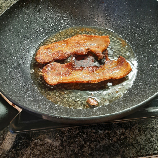 Het spek in een braadpan of de wok krokant bakken en op keukenpapier laten uitdruipen.