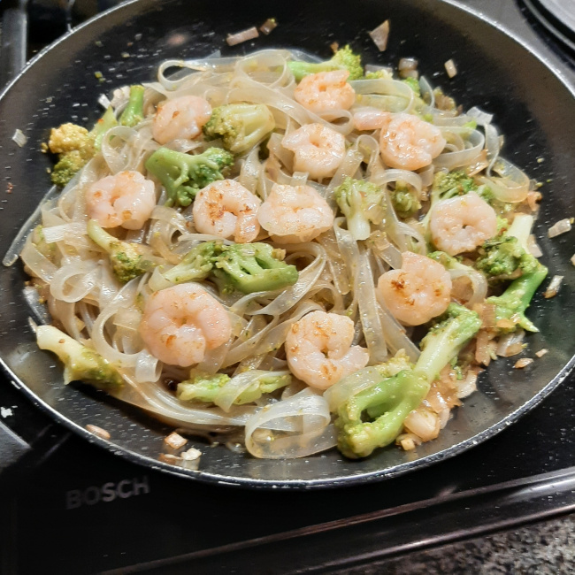 Noedels met broccoli en scampi