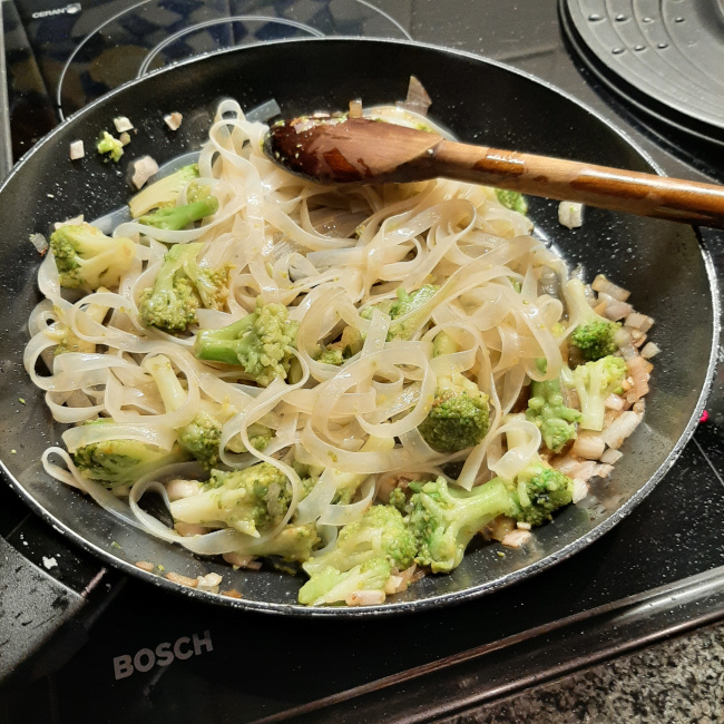 Indien nodig olie toevoegen aan de bakolie van de scampi en daarin de ui en look fruiten. Wanneer deze glazig zijn de broccoliroosjes, de noedels en de helft van de saus toevoegen en al roerend verwarmen garen.