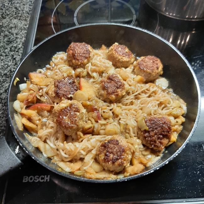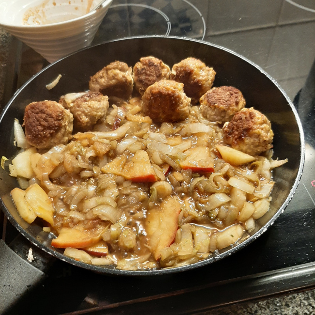 Neem de gehaktballen uit de pan voeg indien nodig een weinig boter toe en stoof de appel en het witloof gaar, voeg de gehaktballen opnieuw toe samen met de helft van de saus.