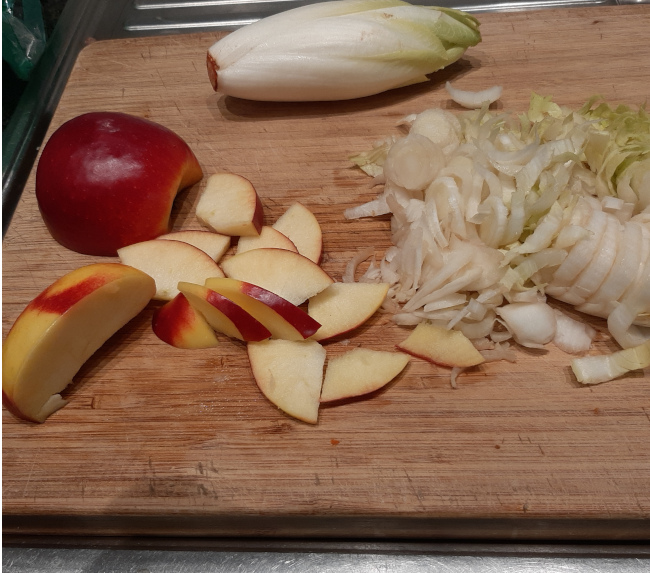 Ondertussen de harde kern onder aan de witloofstronken verwijderen en ze in reepjes snijden. De appel in vier snijden, het klokkenhuis verwijderen en de appel in julienne (reepjes) snijden.