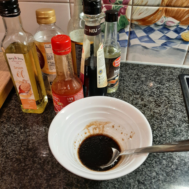Saus: 2 el sojasaus, 1 el vissaus, 1 el mirin (rijstwijn, 1 el rijstazijn, 1 el sesamolie, 2 el neutrale olie, 1 el kandijsuiker
