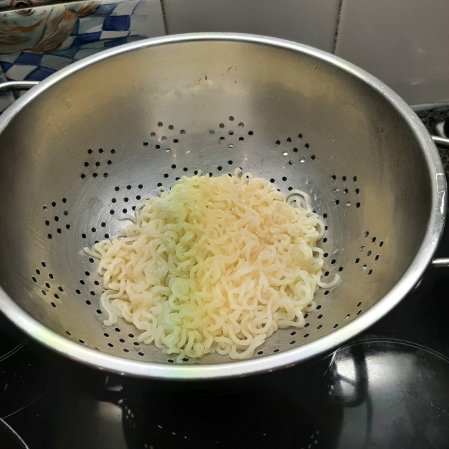De noedels volgens aan wijzingen op de verpakking koken, afgieten en spoelen met koud water, goed laten uitlekken.