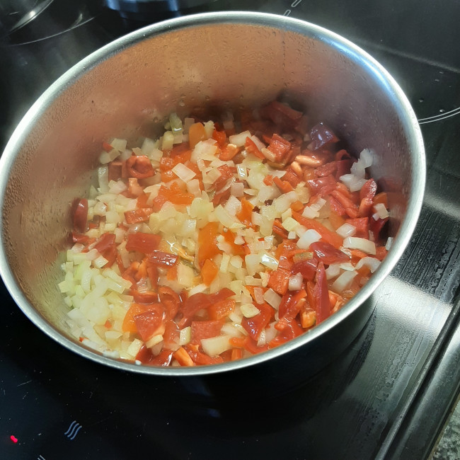 De paprika en de tomaat toevoegen even laten fruiten en dan bevochtigen met water. Aan de kook brengen en de helft van de gespoelde kikkererwten, het bouillonblokje, de fijngesneden oregano en het paprikapoeder toevoegen en 15 minuten laten sudderen.