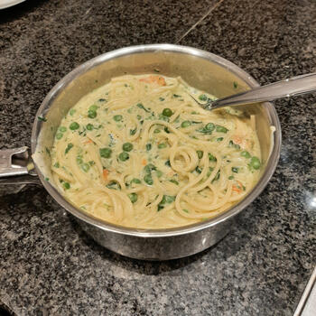 Pasta met spinazie, erwten en kaassaus