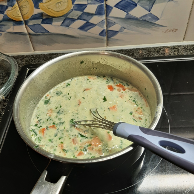 Voeg de diepvriesspinazie toe, laat al roerend ontdooien en enkele minuten sudderen.
