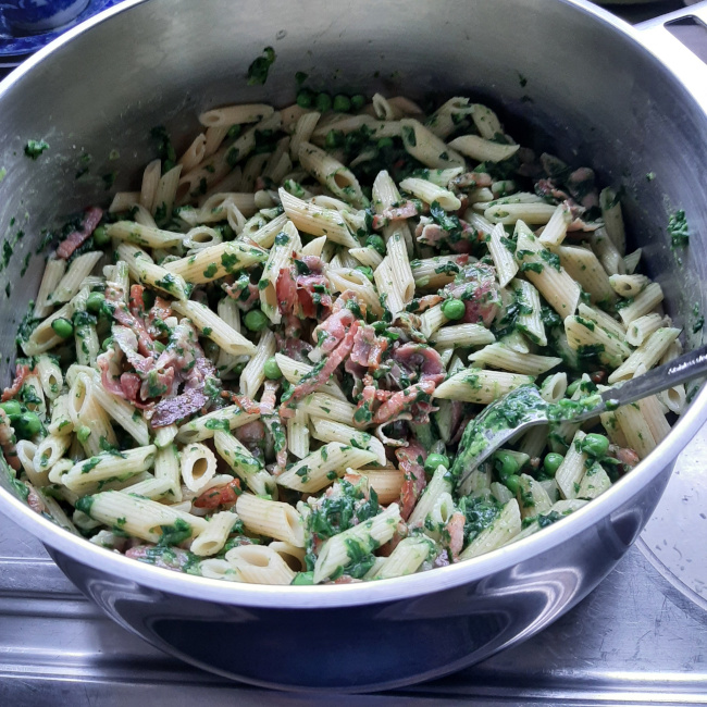 Penne met spek, spinazie, erwten en kaassaus