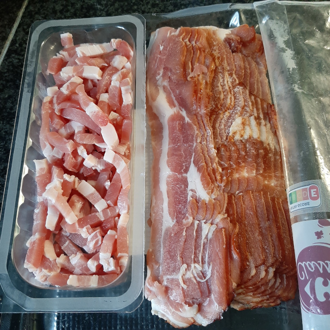 150 g gerookt ontbijtspek, 100 g spekblokjes