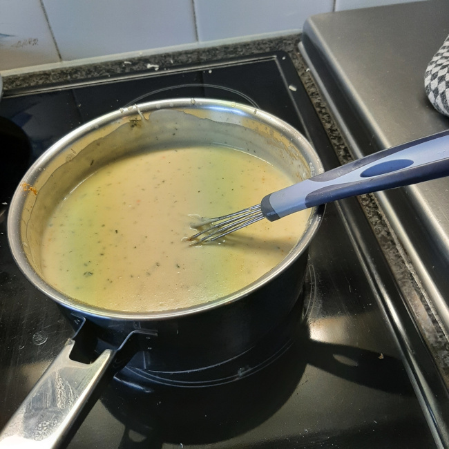 Kaassaus: 40 g boter, 40 g bloem, ½ liter melk, peper, zout, snuif muskaatnoot, kurkuma, 80 g gemalen emmenthaler kaas