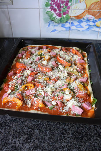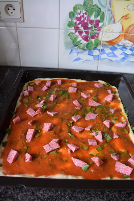 Verdeel de tomatensaus over het deeg, beleg met blokjes droogworst en strooi de helft van kaas over.