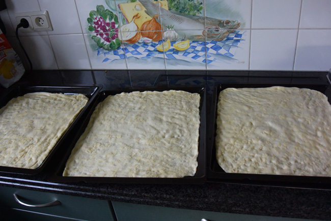 2 pizzabodems of zelf gistdeeg maken voor een volledige bakplaat: Pizzadeeg: 300g bloem, ½ tl zout, 1,5dl water, 10g gist, 2 el olijfolie