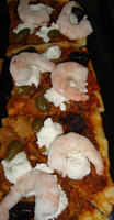 - Beleg met sardientjes, in stukken getrokken mozzarella, lepeltjes ricotta, scampi en bestrooi met oregano
