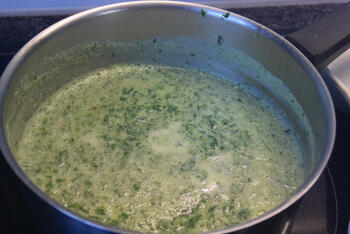 250 g broccoli, 130 g diepvries spinazie, 125 g light room, 1/3 groentebouillonblokje, peper