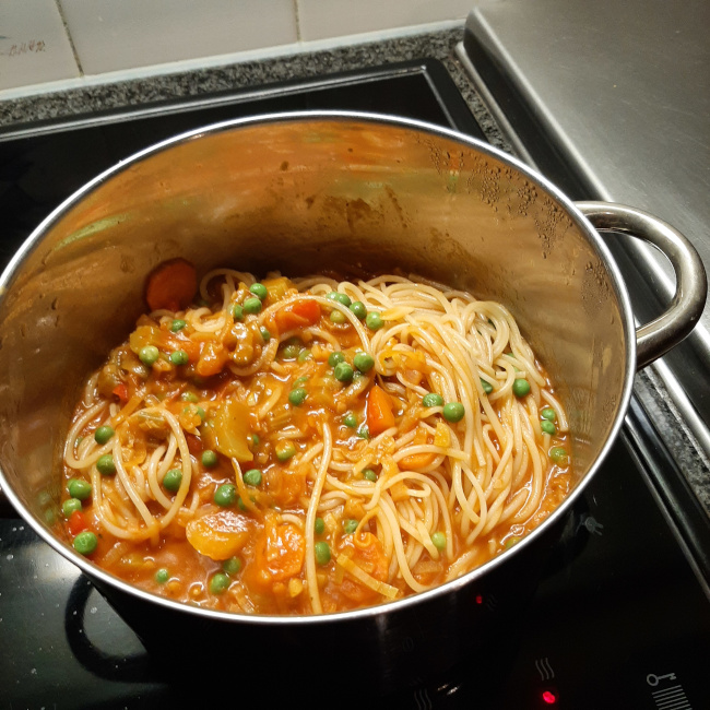 De spaghetti en de erwten aan de saus toevoegen en indien nodig het kookvocht toevoegen.