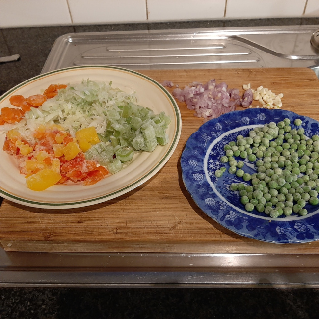 Geut olie, 1 sjalot, 2 teentjes look, 1 rode en 1 gele paprika, 2 stengels bleekselder, 1 wit van prei