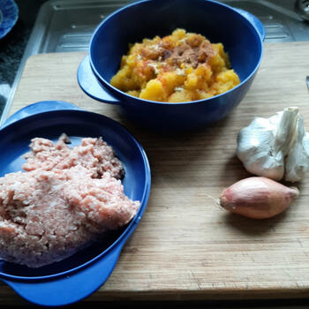 Sjalot en look fijnsnijden en in een geut olie fruiten. Doe ze samen met de pompoenblokjes in de blender en mix fijn samen met het halve verkruimelde bouillonblokje, peper en muskaatnoot. Breng goed op smaak en zet opzij.