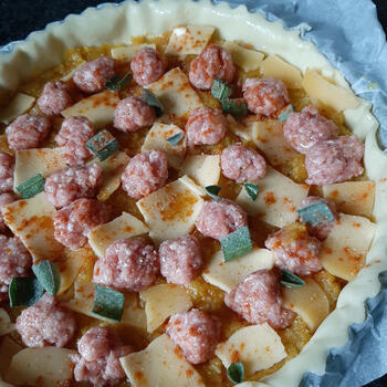 Verdeel het pompoenmengsel over de bodem, leg daarop de gehaktballetjes en tussenin stukjes kaas. Strooi tot slot de salie over het geheel en laat 30 minuten bakken in de oven.