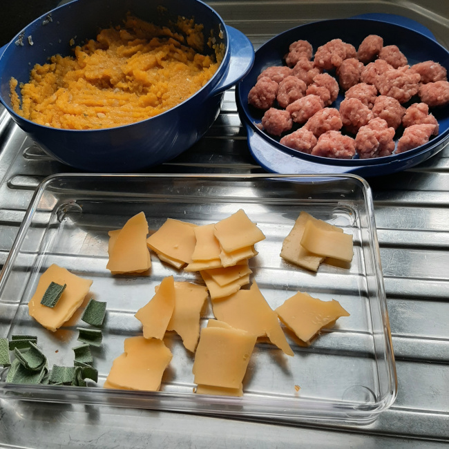 Verdeel het pompoenmengsel over de bodem, leg daarop de gehaktballetjes en tussenin stukjes kaas. Strooi tot slot de salie over het geheel en laat 30 minuten bakken in de oven.