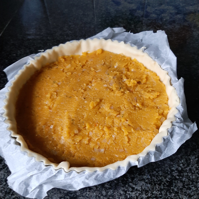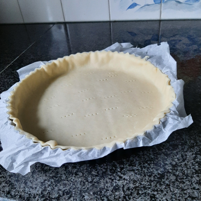Het deeg openrollen en met het papier in de ovenplaat leggen. Het deeg goed tegen de boord naar beneden drukken en het teveel aan de randen verwijderen door met een deegrol over de boord te rollen. Prik de bodem in met een vork.