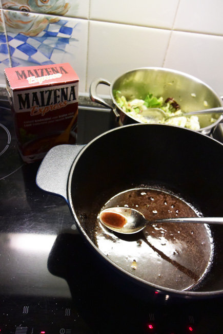Klontje boter, 1 ui, 3 dl rode wijn, 2 dl water, ½ groentebouillonblokje, peper, zout, 1 el bruine sausbinder