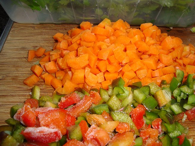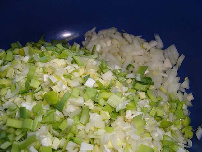 - Al de groenten in kleine blokjes (brunoise) of in smalle reepjes (Julienne) snijden.