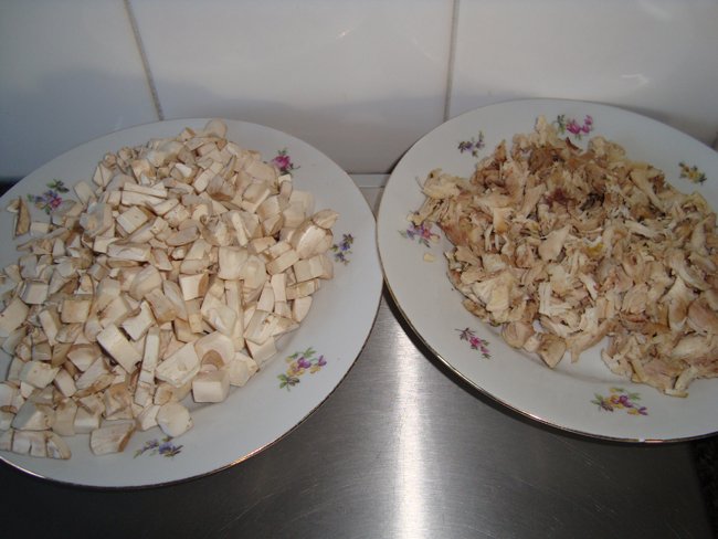 • Neem de kippenbout uit de bouillon, verwijder vel en beenderen, snij het kippenvlees in kleine stukjes en zet opzij.