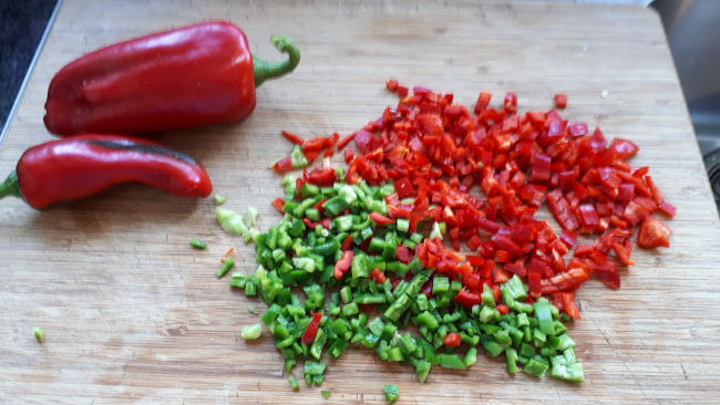 Ondertussen de andere paprika’s fijn snijden.