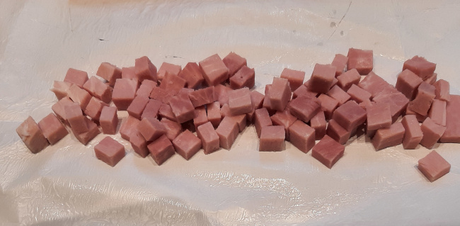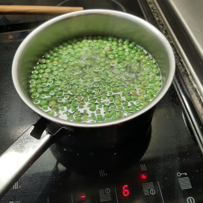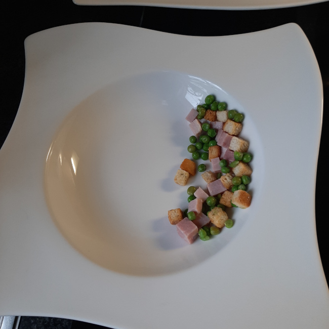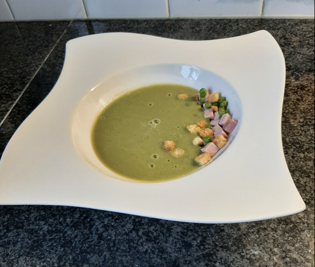 Afwerking: 150 g diepvrieserwten, water, sodabicarbonaat, zout, 200 g gekookte ham in kleine blokjes, gebakken broodkorstjes
