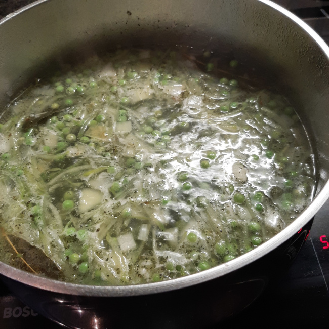 Geut olie, 1 ui, 2 teentjes look, 600g diepvrieserwten, 250g courgette 1,5 l water, 30 g kippenbouillonpoeder, peper, tijm, laurier