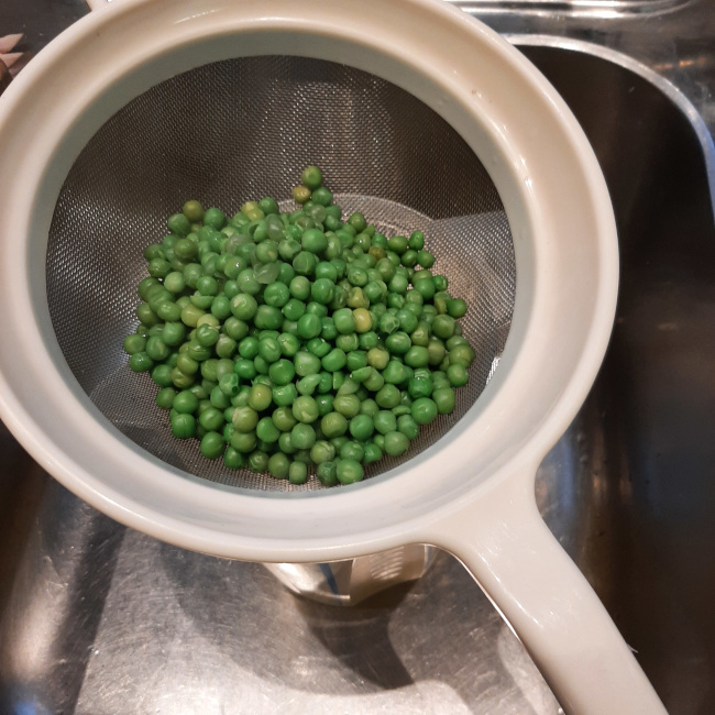 Ondertussen de diepvrieserwten voor de afwerking 7 minuten koken in kokend water met een snuif zout en een snuif bicarbonaat om de mooie kleur te bewaren. Giet af en spoel onmiddellijk met koud water. De ham in kleine blokjes snijden en broodkorstjes bakken en op keukenpapier laten uitdruipen.