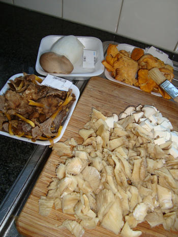 De groenten reinigen en grof snijden. De paddenstoelen met een borsteltje reinigen, maar indien mogelijk niet wassen omdat ze veel vocht opslorpen. Hou een deel kleine paddenstoelen opzij voor de afwerking, snij de andere in gelijke stukken.