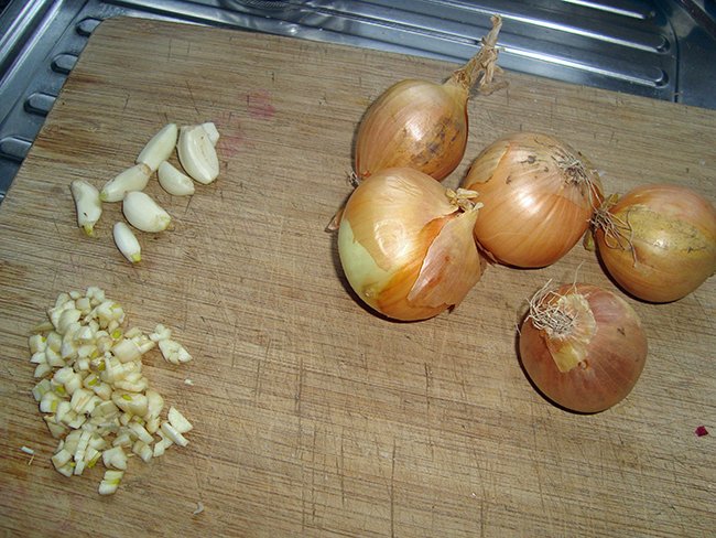 - 1 bol look, 3 uien, 3 wit van prei, 3 aardappelen, 2 liter water, 4 kippenbouillonblokjes, peper, laurier, tijm, peterseliestengels