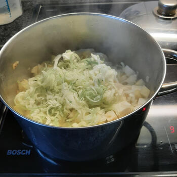 De knolselder en aardappelen schillen en in blokjes snijden. De prei in reepjes snijden en de ui en look grof snijden.