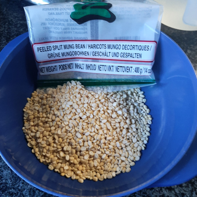 Mungobonen (Aziatisch) het zijn gepelde en gedroogde groene mungobonen, ze zijn nog kleiner de linzen. Indien je ze niet hebt kan je ze vervangen door een blikje witte bonen.