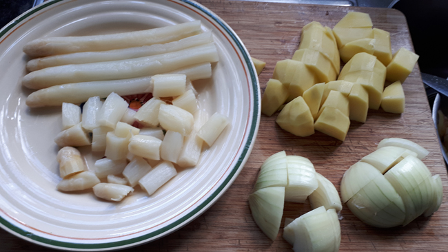 De ui, asperges en aardappelen schillen. De ui in stukken snijden, de asperges in stukken van 2 à 3 cm en de aardappelen eveneens in stukken snijden. |
