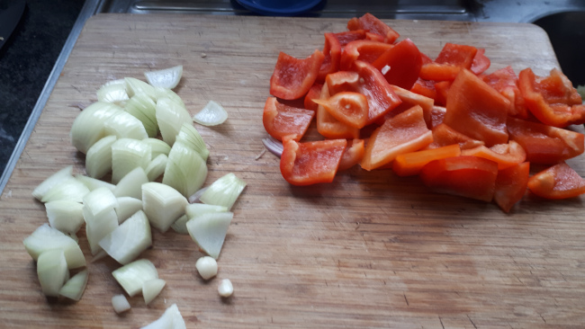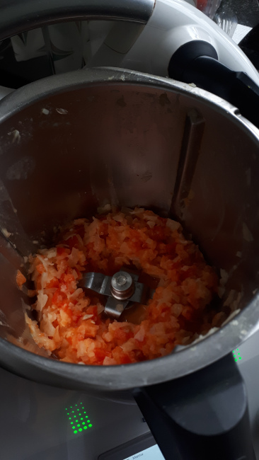 Saus: 2 uien en 2 rode paprika’s grof snijden. Doe de uien in mengbeker en mix. Schraap naar beneden, voeg 20 g boter toe en laat fruiten. |