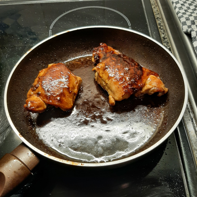 Marinade: 2 el sojasaus, 1 el vissaus, 1 el sesamolie, 1 el rijst of wijnazijn, 1 el sweet chilisaus, 1 el kandijsuiker, 2 el neutrale olie