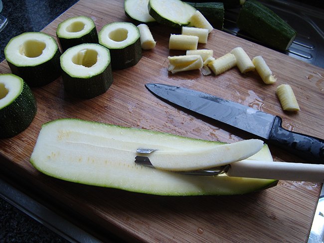 • De courgettes wassen, de uiteinden verwijderen en in de lengte halveren. Met een lepeltje, een appelboor of een aardappelboor de pitjes uit de courgette verwijderen. Hou dit apart voor de tomatensaus. De courgette met zout bestrooien en omgekeerd laten uitlekken. Een ovenschaal met olie instrijken.