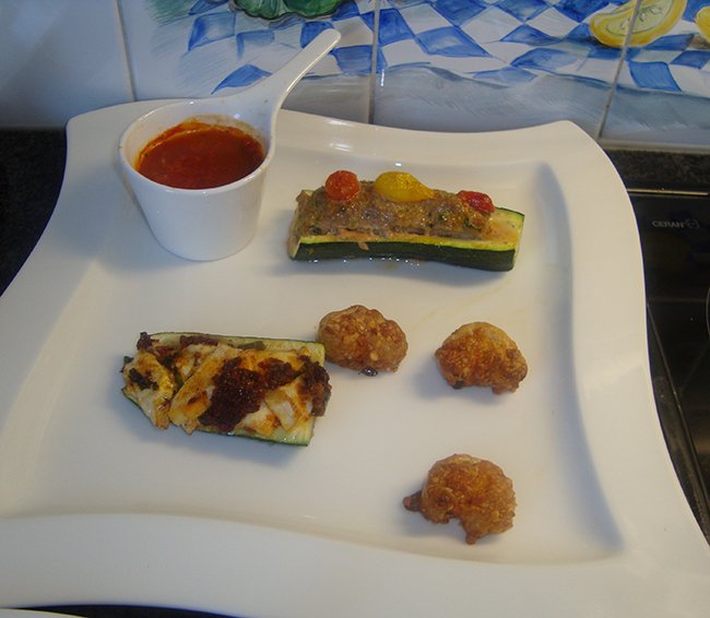Als hapje: snij de courgette in stukken van 3 à 4 cm. Haal het binnenste van de courgette uit met een appelboor. Vul met de vulling, plaats rechtop staand in een vuurvaste schaal en bak 20 minuten in een oven van 200°C. je kan dit, zonder de saus, samen opdienen met courgette gevuld met geitenkaas en zongedroogde tomaten. Zie voorgerechten: “Gevulde courgette met geitenkaas en zongedroogde tomaten.”