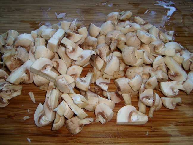 - De champignons in vier of in schijfjes snijden, toevoegen aan de ui, kruiden met peper en zout en besprenkelen met het citroensap. Laat enkele minuten fruiten.