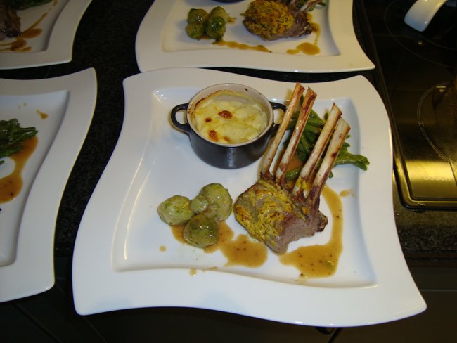 Lamscarré met mosterd, groentjes en aardappelgratin