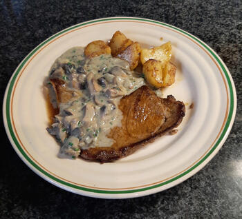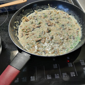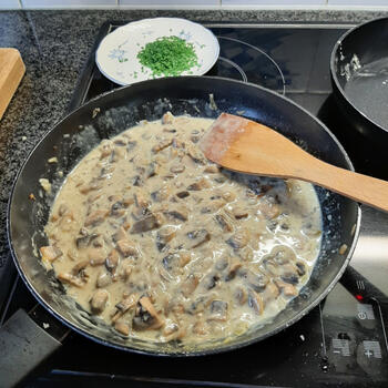Saus: klont boter, 250 g champignons, 1 sjalot, 2 teentjes look, 1,5 dl room of light room, 1,5 dl water, ¼ verkruimeld bouillonblokje, peper, 1 el citroensap, 1 el fijngesneden peterselie