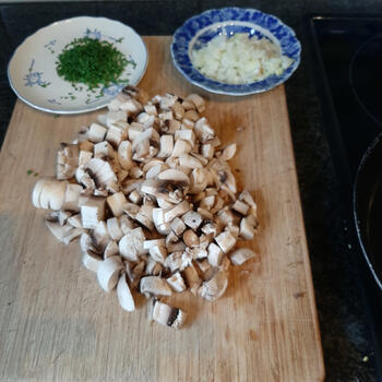 De champignons schoonborstelen en in plakjes snijden. De sjalot, look en peterselie, fijnsnijden