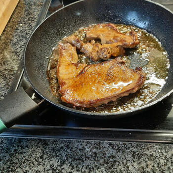 Klontje boter, geutje olie, 1 grote lamssnede of 2 kleine, peper, zout