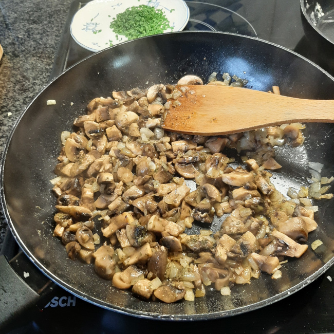De boter en olie verwarmen en de champignons bakken, de sjalot en look toevoegen en laten fruiten, bevochtigen met het water en de room, laten inkoken en afkruiden met een stukje bouillonbouillonblokje, peper, citroensap en net voor het opdienen peterselie.