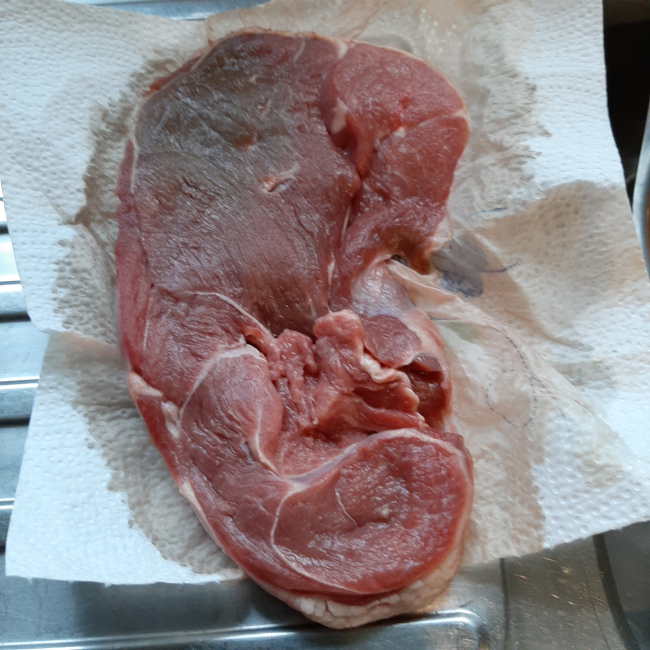Klontje boter, geutje olie, 1 grote lamssnede of 2 kleine, peper, zout