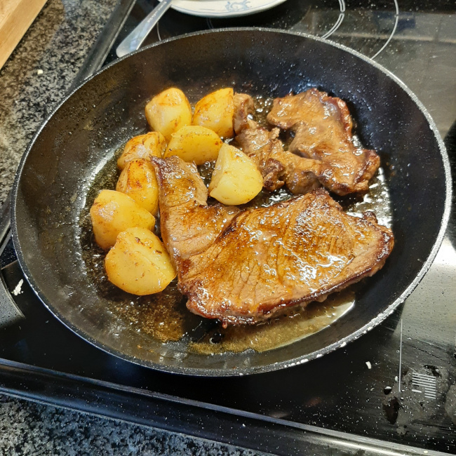 De lamsnede op kamertemperatuur laten komen, kruiden met peper en zout en mooi bruin bakken aan beide zijden. De gare aardappelen toevoegen en even verwarmen en meebakken. Het vlees mag nog wat roze zijn vanbinnen en even laten rusten.